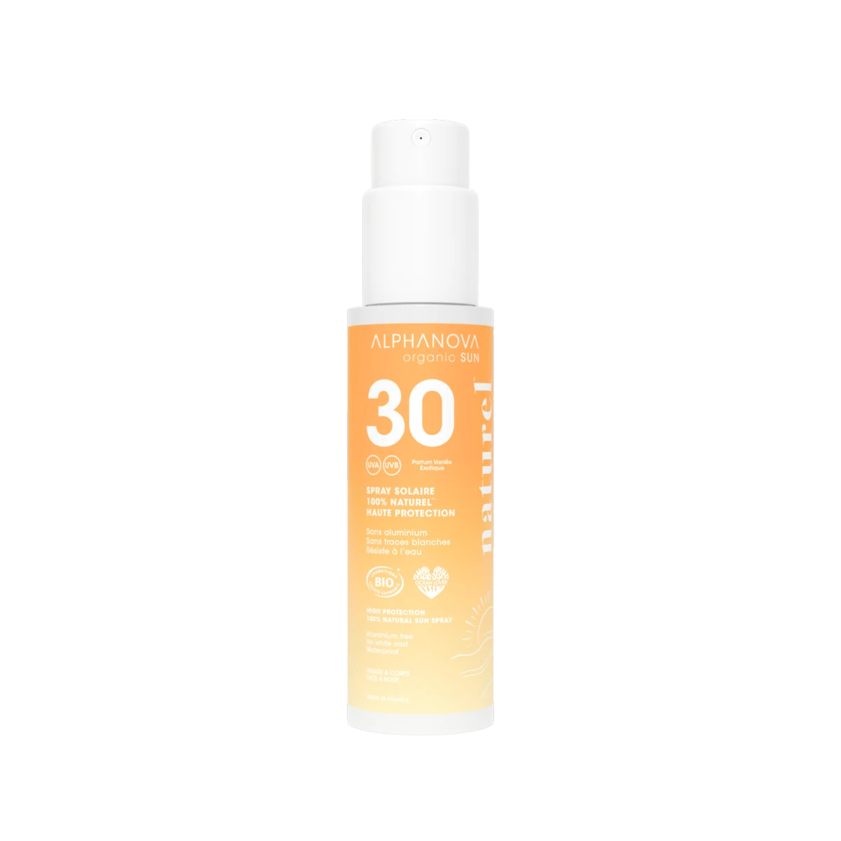 Este spray protector solar mineral FPS 30 100% natural** proporciona protección inmediata contra los rayos UVB y UVA gracias a filtros minerales naturales con efecto escudo, todo para un resultado sin marcas blancas.